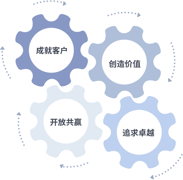 成就客户是一切决策的出发点,,创造价值是衡量所有工作的标准,,追求卓越是我们做事做人的态度,,,,开放共赢是我们的格局也是最终的结果。。价值观的齿轮环环相扣,,,,推动着组织里的每个人不断向前。。。。