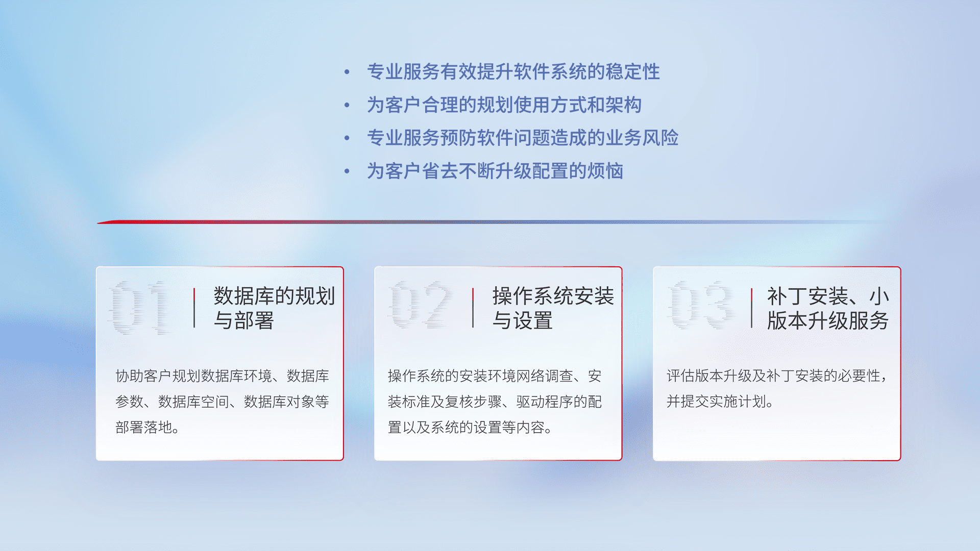 为客户提供软件规模升级、、、快速部署、、、、按需配置的专业服务,,,从数据库的规划与部署到操作系统的安装与设置,,再到补丁安装和小版本升级提供支持。。。。