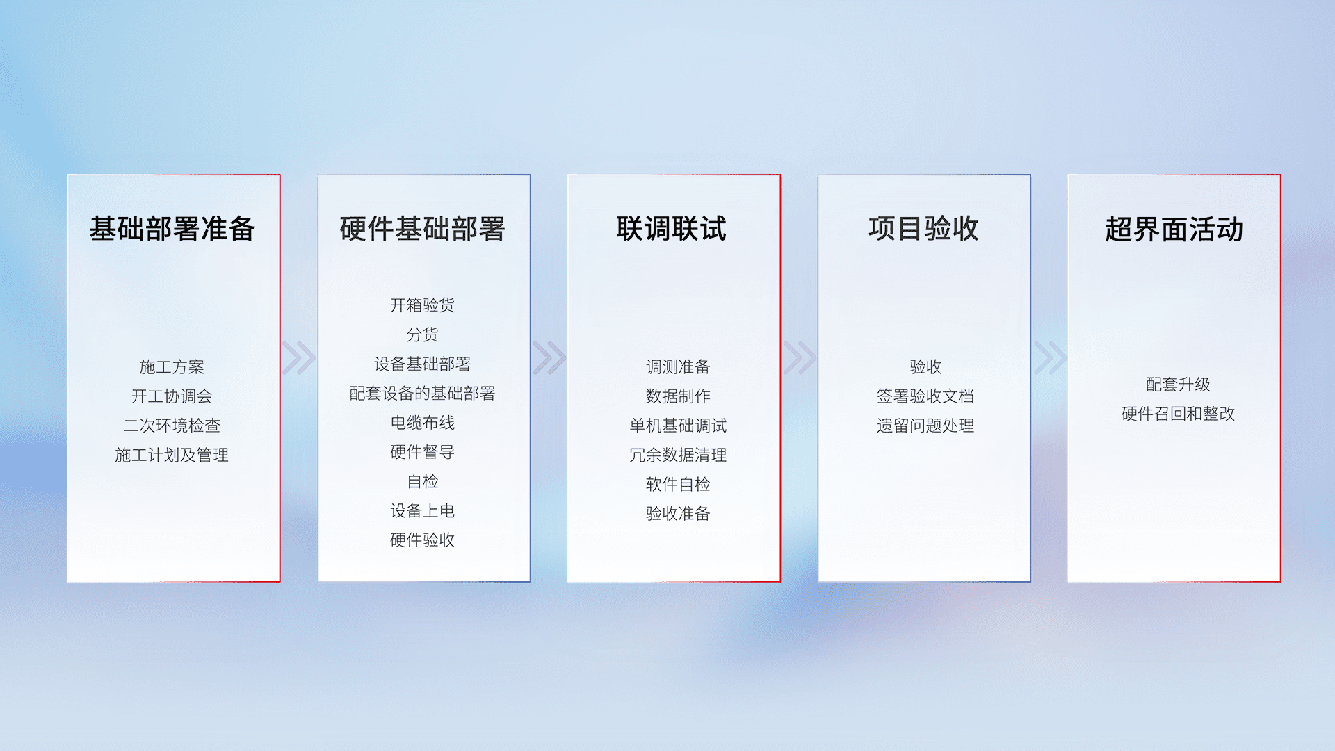 从基础部署准备、、、、硬件基础部署、、、、联调联试、、、项目验收、、越界面活动的全过程可追溯,,,,保证施工质量和进度。。。。